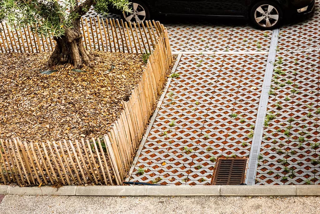 👉Création de places de parking désimperméabilisées (pas de béton, pas de goudron) pour favoriser l’infiltration des eaux pluviales