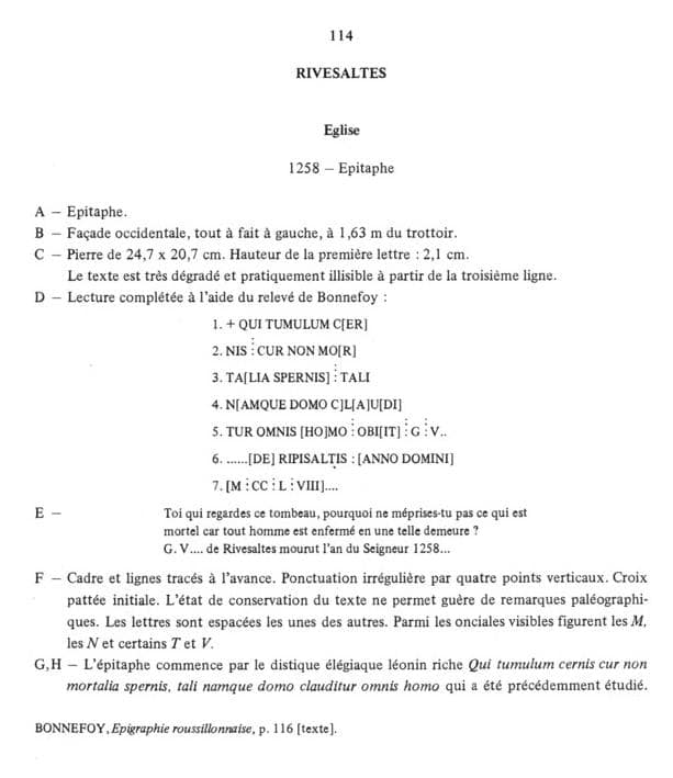 Cela dit: « Toi qui regarde ce tombeau, pourquoi ne mĂ©prises-tu pas ce qui est mortel car tout homme est enfermĂ© en une telle demeure ? G.V. de Rivesaltes mourut l’an du Seigneur 1258